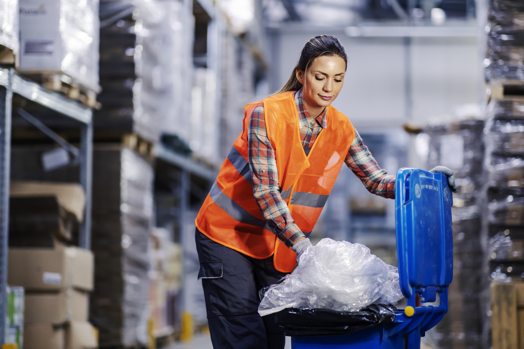 A female storage worker putting plastic bags into recycle...