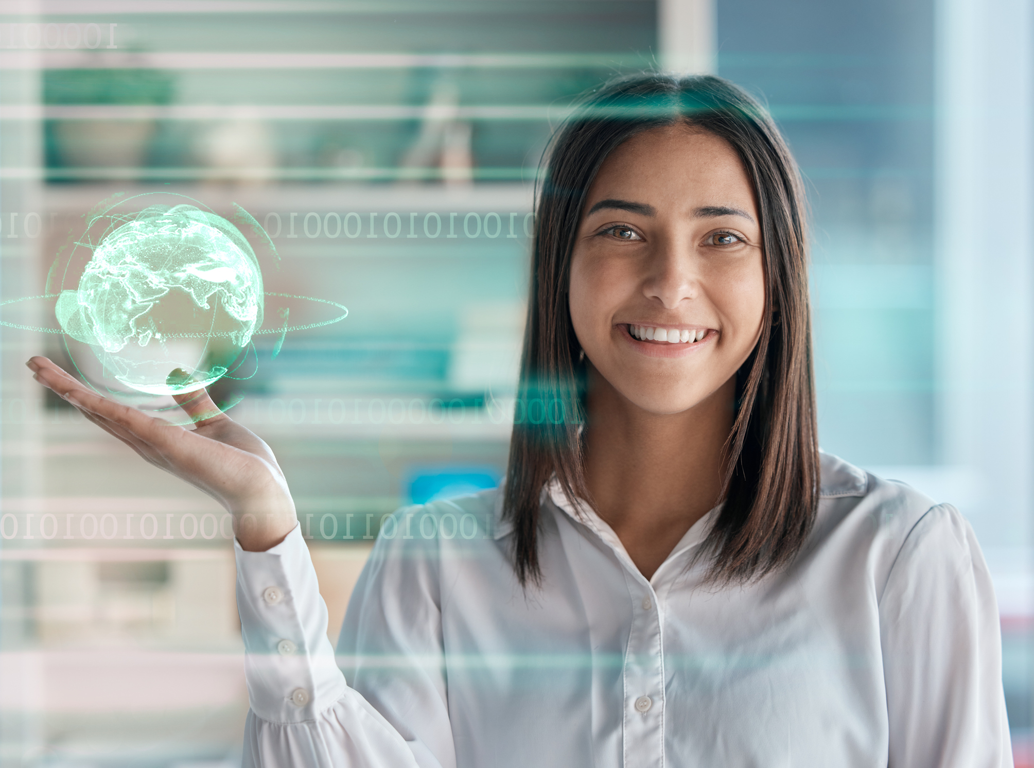 Earth, hologram in palm and business woman networking, smile and futuristic portrait in binary overlay. Holographic world, 3d hand and globe for future sustainability, eco friendly and globalization