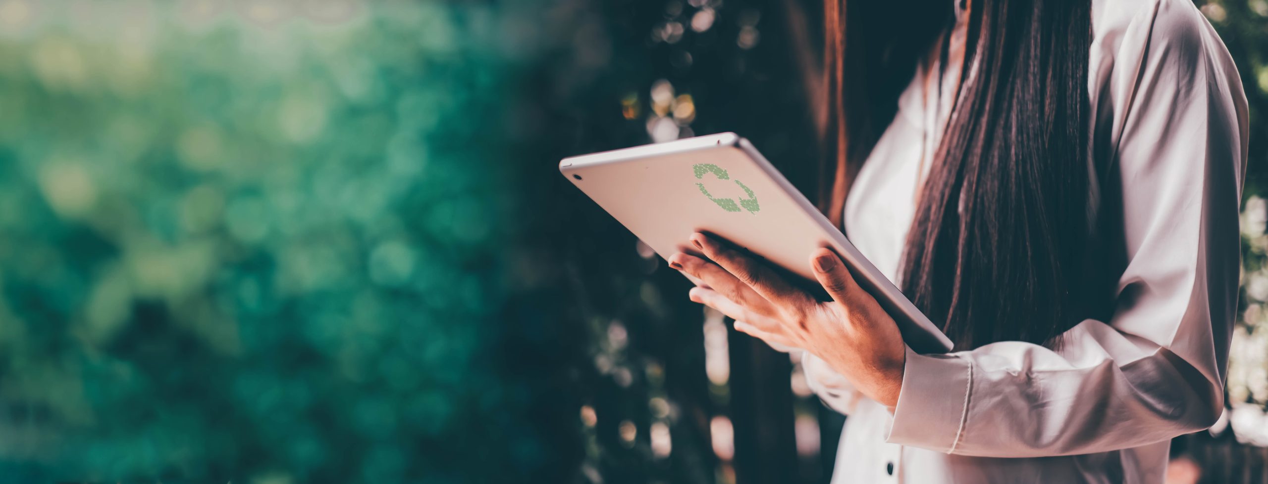 Young businessmen analyze Environmental protection business to meet goals set over blurred Nature background .Film tones and Light fair. select focus